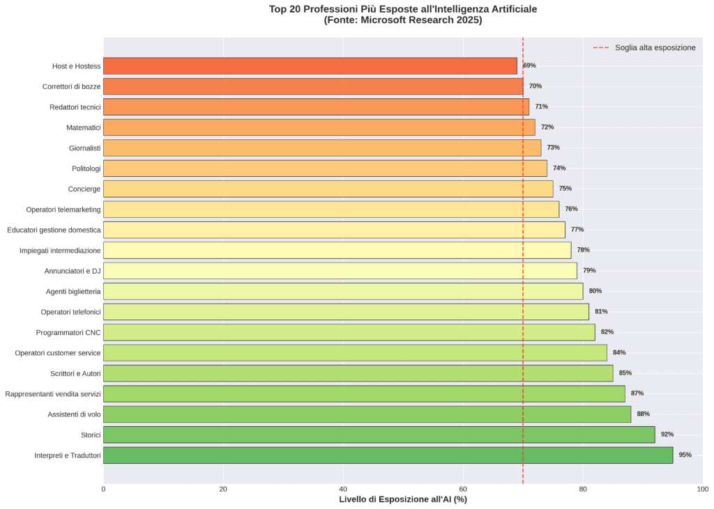 Microsoft ha pubblicato uno studio che identifica i 40 lavori più esposti all’intelligenza artificiale. In cima alla lista: traduttori, storici, scrittori, customer service, rappresentanti di vendita, giornalisti.
